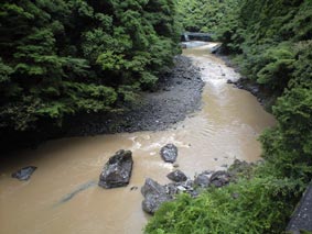 「槇山川」:29日より別府地区で96mm/日の雨量となっており、大増水状態。水色もコーヒー牛乳よりもひどい状況となっており、解禁日は釣りにならない。3〜4日程は無理だろう。