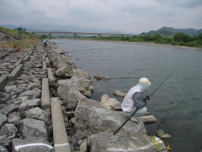 只今減水中の物部川。小雨の為20%の取水制限となっており30日午前9時頃より10pほど減ってきた。それでも岡山県から来川した3人組は、戸板島橋上流側で午後2時頃は平均15匹以上を釣り上げていた。しかし、アユの3倍掛かるボウズゴリに頭をかかえる場面も見られるが今日1日ゆっくり楽しんでもらいたいものだ。