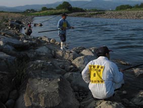 会場である旧国道橋周辺では、15日より大勢の釣り人により釣られた後にもかかわらず、しかも時々雨という悪条件の中、あちらこちらで竿の曲がる場面があり、さすがに「うーん」と感心することしきり・・・・・。結果としては、下流部の平松で釣れた20匹が最高だったとか。さて、決勝の結果はこのページでは分かっていませんが、今日の雨で水も多少変わり、明日から晴天となり水況も落ち着くとアユ達も入れ替わり、また、うれしい釣果に巡り会えると思われます。(午前中の釣果です)